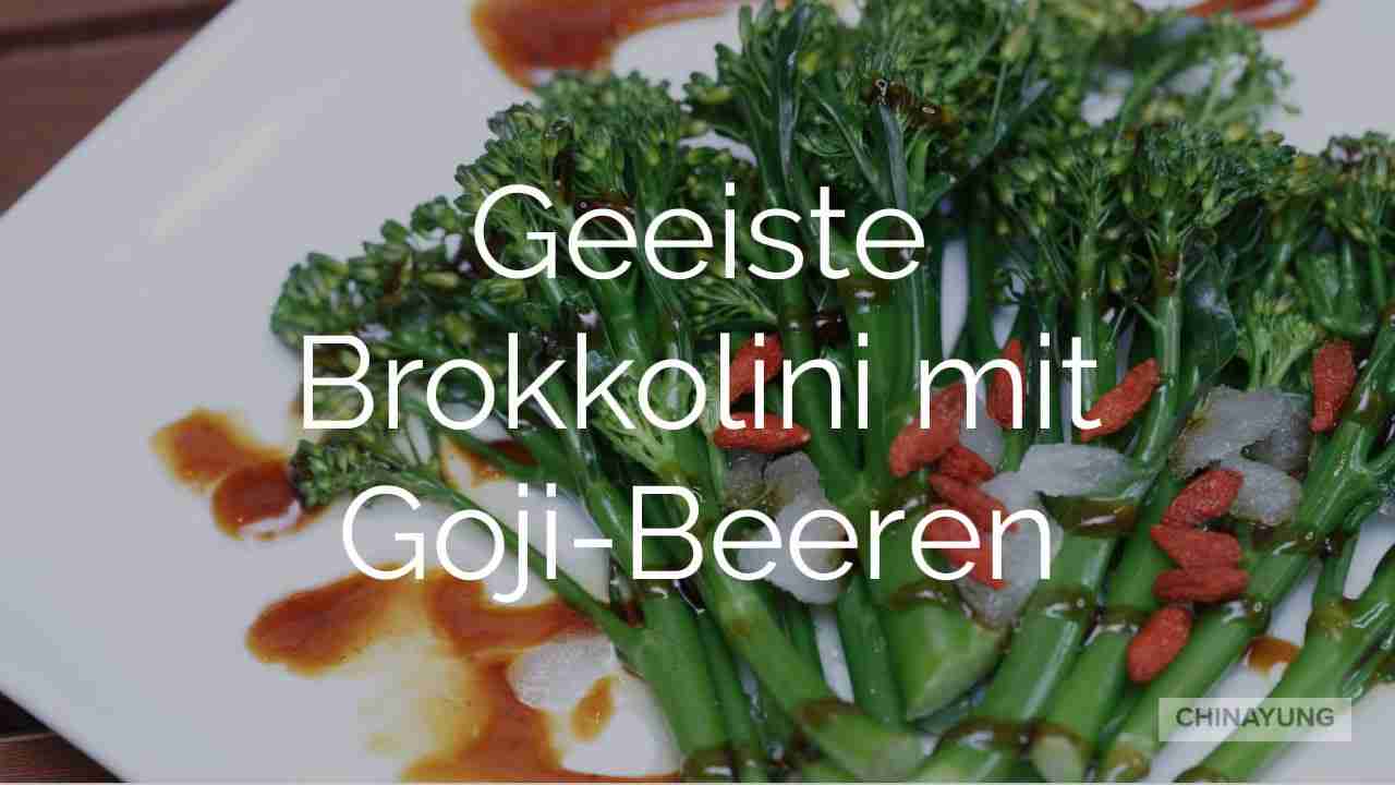 Geeiste Brokkolini mit Goji-Beeren, Austernsauce ist ein sehr erfrischendes Sommergericht. Die Brokkolinis werden kalt serviert. Es schmeckt fein und knackig. DIe süß-sauren Eiswürfeln verleiht die Brokkolinis einen schönen Kontrast